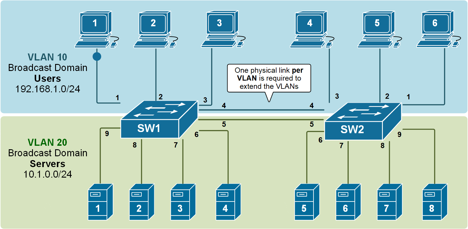 Switch A (VLAN 10,20,30) --- Switch B (VLAN 10,20,30)
