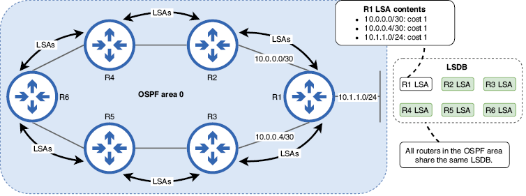 Es fundamental que todos los routers del área tengan la misma LSDB, de modo que cada router pueda usar el algoritmo SPF para calcular rutas a todas las redes de destino. Por ejemplo, los routers de la figura anterior usarán la LSDB para calcular una ruta a la red 10.1.1.0/24. Al usar la LSDB, es como si los routers vieran el mismo diagrama que nosotros, pero con información más detallada sobre cada enlace. Esto contrasta con los protocolos de enrutamiento por vector de distancia como RIP y EIGRP, donde cada router no tiene un mapa completo de la red.