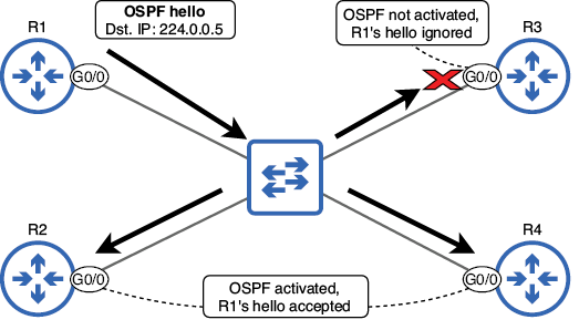 - Los mensajes de saludo OSPF se envían a la dirección IPv4 de multidifusión 224.0.0.5. Esta dirección se utiliza para enviar mensajes a todos los routers OSPF del segmento.