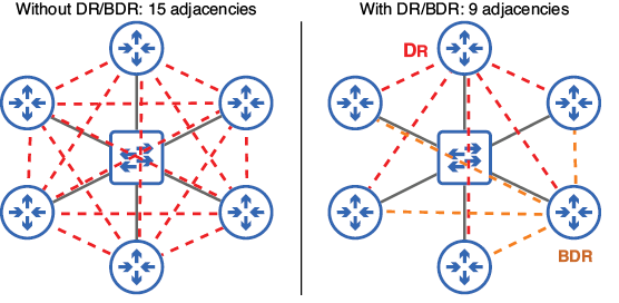 - Todos los routers del segmento establecen una adyacencia completa con el DR/BDR, pero los DROthers siguen siendo vecinos en el estado bidireccional entre sí.