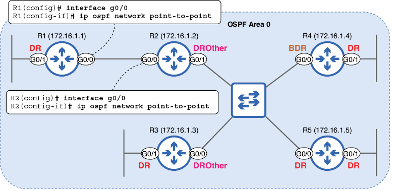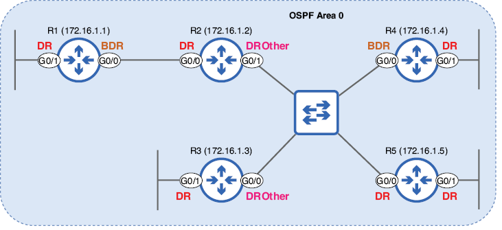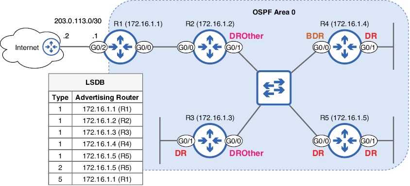 R3, R4 y R5 no anuncian una LSA de tipo 2 para sus interfaces G0/1. Como se mencionó anteriormente, al no tener vecinos en esas interfaces, son DR solo de nombre.