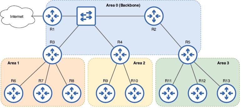 | Router interno | R1, R2, R6, R7, R8, R9, R10, R11, R12, R13 | Todas las interfaces habilitadas para OSPF están en la misma área. |