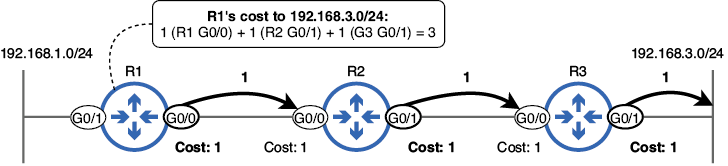Figura 3. El costo de una ruta es el costo acumulado de cada interfaz desde la cual se debe enviar un paquete para llegar a su destino. El costo de R1 para llegar a 192.168.3.0/24 es 3: 1 para R1 G0/0, más 1 para R2 G0/1, más 1 para R3 G0/1.