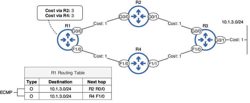Figura 4. Aunque la ruta a 10.1.3.0/24 vía R2 es superior a la ruta vía R4, el costo OSPF de ambas rutas es el mismo. R1 agrega ambas rutas a la tabla de enrutamiento y las distribuye mediante ECMP.