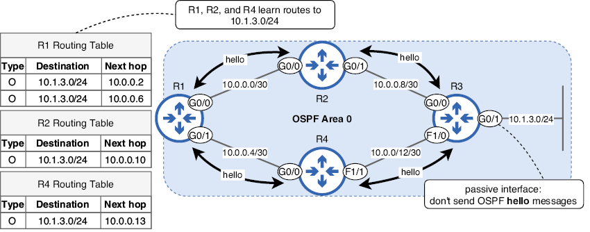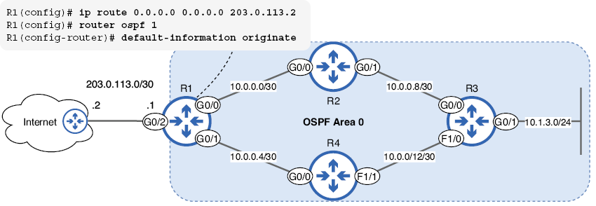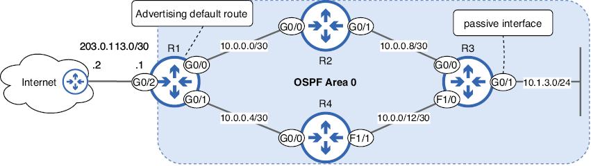 Aquí se muestra la topología que configuraremos en esta sección: una red OSPF de área única con cuatro routers. La subred 10.1.3.0/24 está conectada a R3 G0/1, que configuraremos como interfaz pasiva (más información más adelante). R1 se conecta a internet y lo configuraremos para que anuncie una ruta predeterminada a los demás routers.