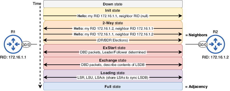 - Hay siete estados vecinos OSPF: Inactivo, Inicial, Bidireccional, ExStart, Intercambio, Cargando y Completo.