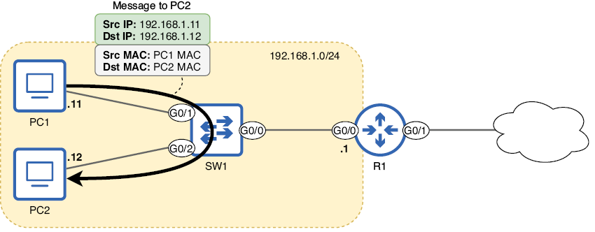 La imagen de abajo muestra este proceso cuando el PC1 envía un paquete a el PC2. Las direcciones IP y MAC de destino son ambas de el PC2; No es necesario que R1 enrute el paquete porque el origen y el destino están en la misma red (la red 192.168.1.0/24).