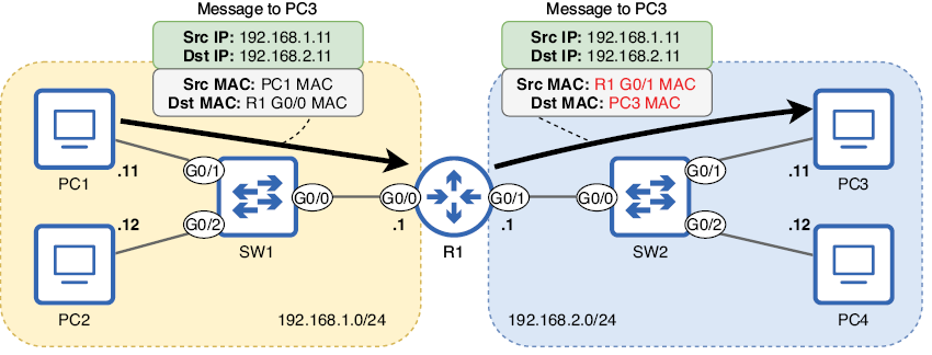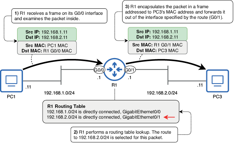 PC1 (192.168.1.11) envía un paquete a PC3 (192.168.2.11). Dado que PC1 y PC3 se encuentran en redes separadas, PC1 envía el paquete en una trama dirigida a la dirección MAC de su puerta de enlace predeterminada: la de la interfaz G0/0 de R1. R1 reenvía el paquete desde su interfaz G0/1, encapsulado en una nueva trama dirigida a la dirección MAC de PC3.