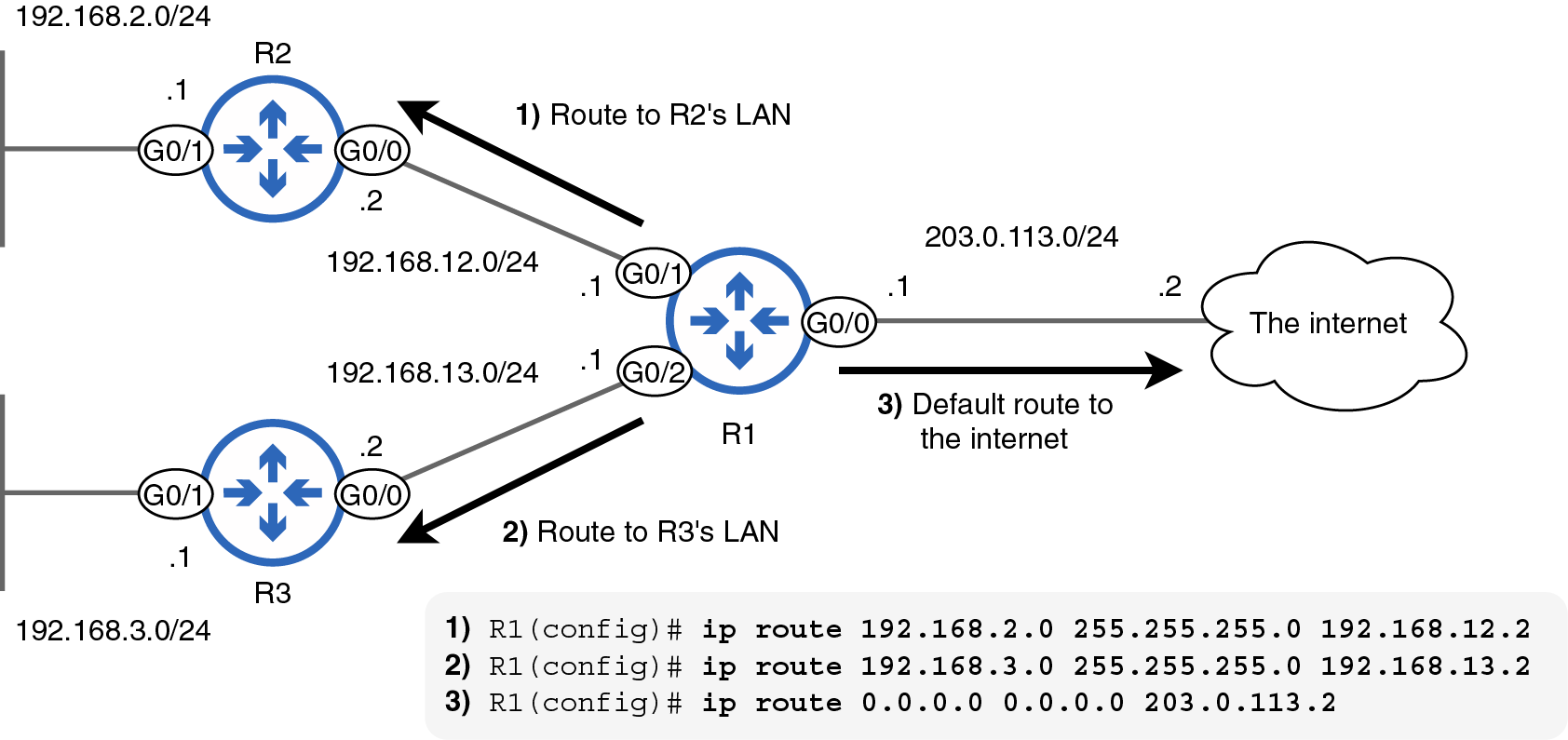 La imagen de abajo muestra un ejemplo: R1 tiene rutas específicas a 192.168.2.0/24 y 192.168.3.0/24, y luego una ruta predeterminada a internet; los paquetes con destinos que no coincidan con 192.168.2.0/24 o 192.168.3.0/24 (o las rutas conectadas y locales de R1) se reenviarán utilizando la ruta predeterminada.