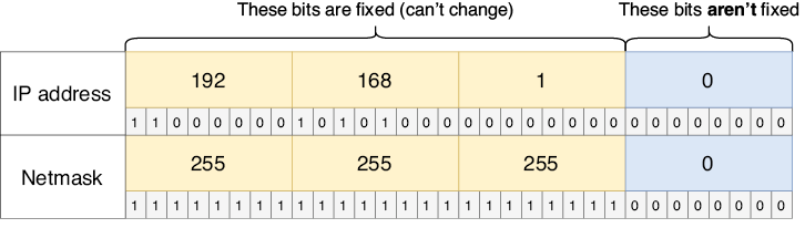 A modo de recordatorio rápido, la siguiente imagen muestra cómo la ruta a 192.168.1.0/24 incluye todas las direcciones IP desde 192.168.1.0 hasta 192.168.1.255. La parte de red de la dirección de la ruta es fija, pero la parte del host puede ser cualquier número de 8 bits.