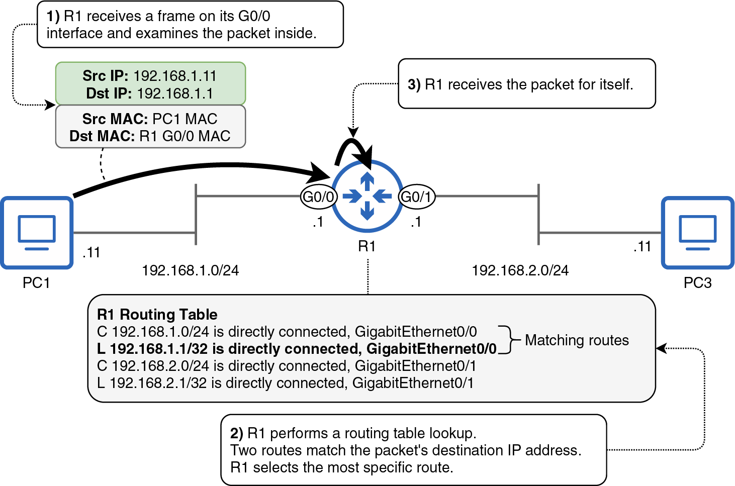 Con estas rutas en su tabla de enrutamiento, R1 sabe que para reenviar un paquete a un host con una dirección IP en las redes 192.168.1.0/24 o 192.168.2.0/24, debe enviar el paquete desde la interfaz especificada en la ruta en una trama dirigida directamente al host de destino. Esto se vio en la imagen de más arriba donde la dirección IP de destino del paquete era 192.168.2.11 (PC3), por lo que R1 reenvió el paquete desde la interfaz G0/1 en una trama dirigida a la dirección MAC de PC3.