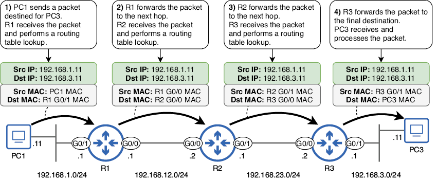 En la imagen se muestra cómo PC1 envía un paquete a PC3: encapsula el paquete en una trama dirigida a la dirección MAC de la interfaz G0/0 de R1. A continuación, R1 reenvía el paquete fuera de su interfaz G0/1, encapsulado en una nueva trama dirigida a la dirección MAC de PC3.