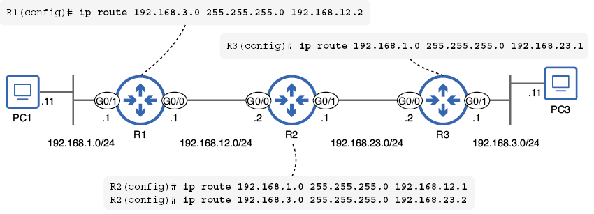 R1(config)# ip route 192.168.3.0 255.255.255.0 g0/0 192.168.12.2R2(config)# ip route 192.168.1.0 255.255.255.0 g0/0 192.168.12.1R2(config)# ip route 192.168.3.0 255.255.255.0 g0/1 192.168.23.2R3(config)# ip route 192.168.1.0 255.255.255.0 g0/0 192.168.23.1