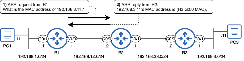 - 192.168.3.11 no es la dirección IP de R2, pero R2 tiene una ruta a 192.168.3.0/24 en su tabla de enrutamiento, por lo que R2 usa ARP proxy para responder en nombre de PC3.